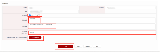 2、不需分管领导签字,但仍需相关负责人审核的材料,需按照线上流程在系统内提交申请,印章方式选择线下,并上传文件。