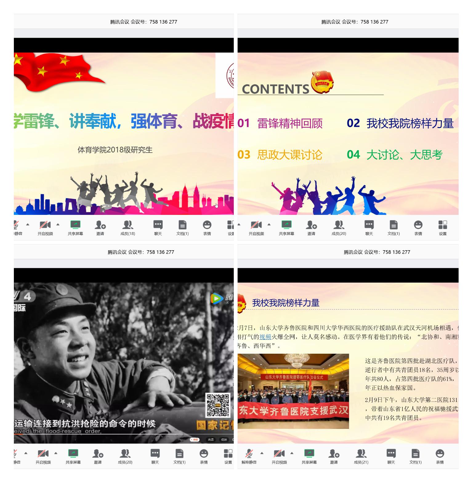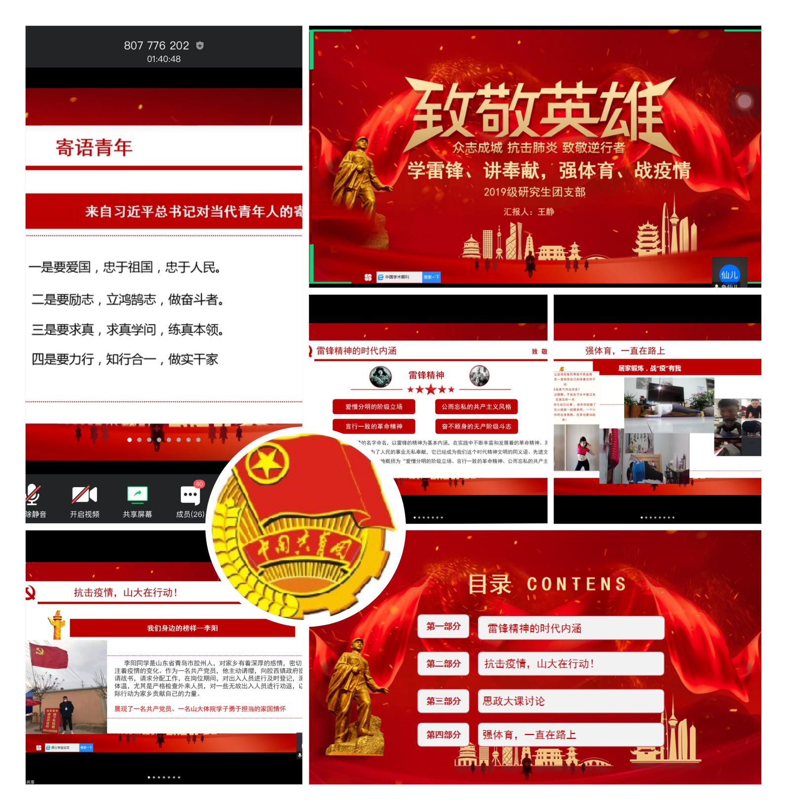 学院本次主题团日活动聚焦新冠疫情发生以来青年学子所做所感所想,结合全国上下万众一心、众志成城的全民防疫战,阐释新时代“雷锋精神”,同时也就beat365中文官方网站加强疫情期间公共体育线上教学和在线居家体育锻炼指导等体育育人工作,发出学院青年团员声音,为中国人民战胜疫情、学校学院事业发展双胜利作出新时代团员贡献!