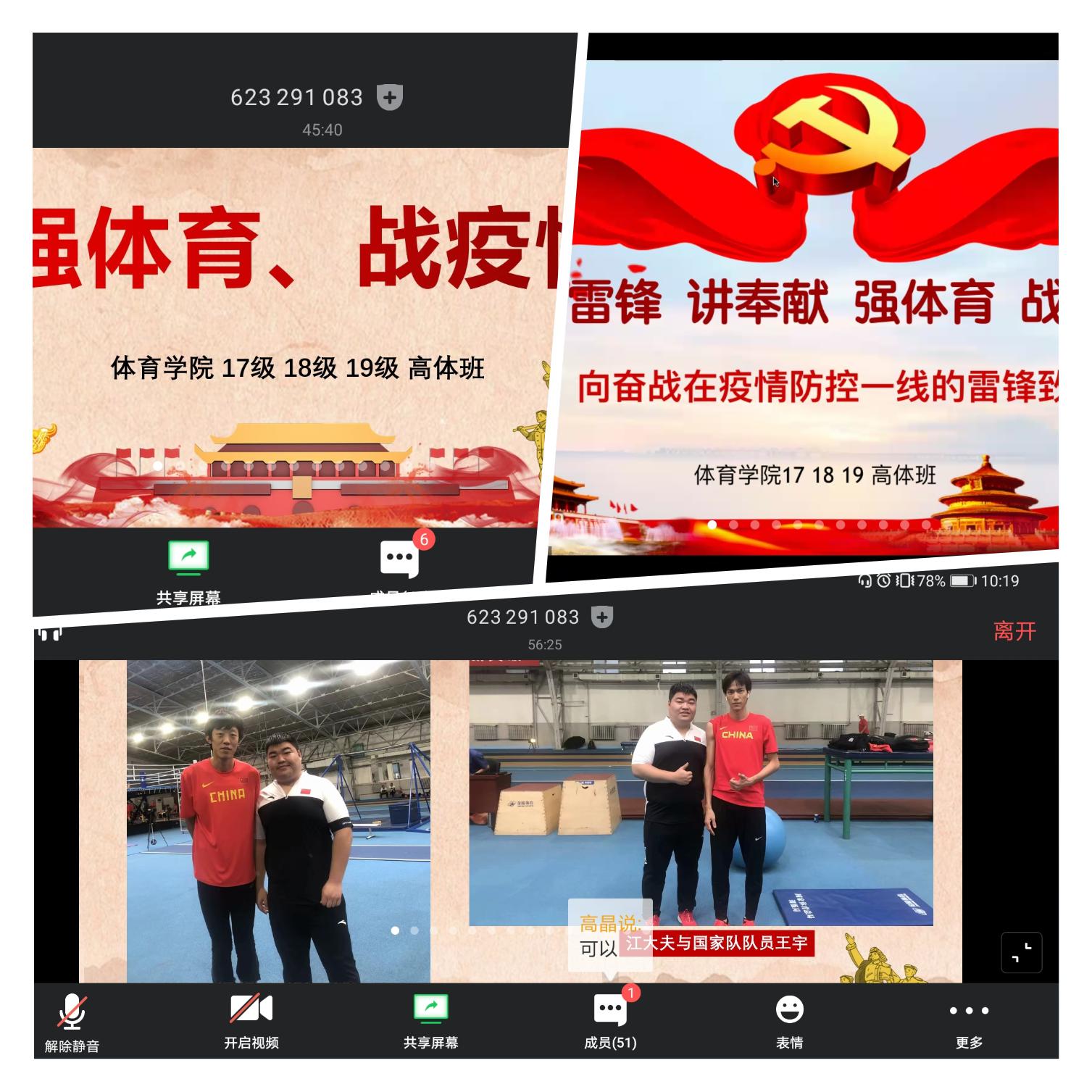 百花齐放,各团支部认真设计精彩纷呈——为开好本次主题团日活动,学院各团支部进行了精心准备和认真设计,展示了beat365中文官方网站特有的青年学习模式。高水平运动员三个年级的团支部采取了合堂的形式,他们不仅仅学习和讨论了学院团委既定的规定内容,也充分结合运动员近期学习、训练所需,邀请了国家队队医江涛,连线解答同学们居家训练中的各类问题。2019级研究生团支部全体团员在本次主题活动中积极参与,利用语音和文字两种形式互动反馈,充分发表自己的见解,真正实现以“小我”融入“大我”,用自己的专业知识在这场战“疫”中肩负山大担当,勇担国家使命。