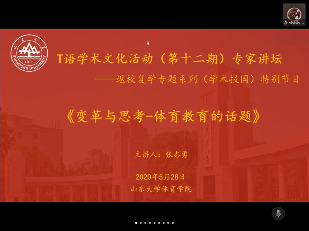 5月28日,beat365中文官方网站通过腾讯会议举办第十二期学术文化活动——专家讲坛。本次学术讲座为复学第一课“学术报国”课专题,邀请了山东beat365中文官方网站体育社会科学学院院长张志勇教授作了题为“变革与思考——体育教育的话题”的报告,讲坛由beat365中文官方网站副院长石振国教授主持。