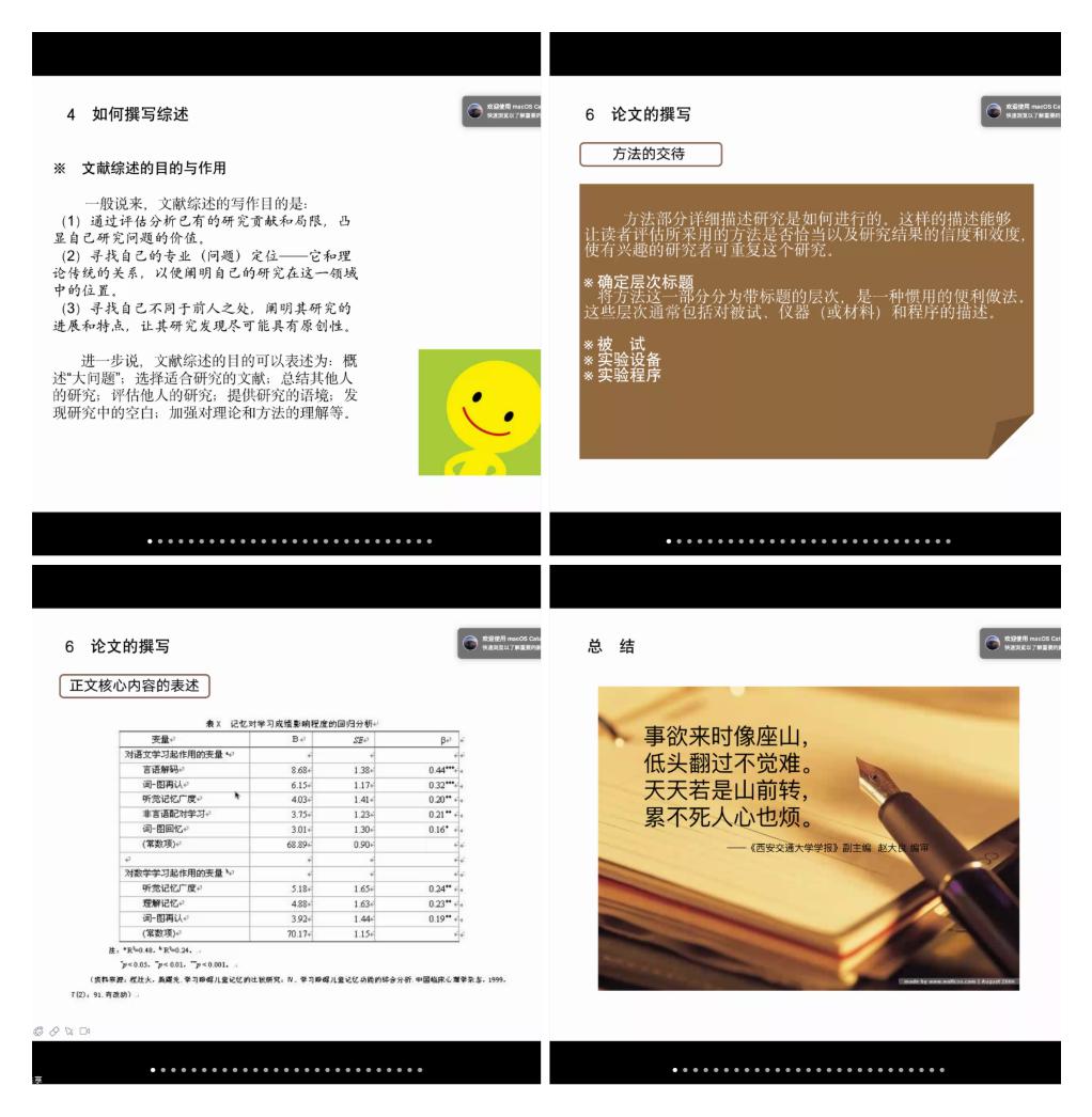 李军从七个部分阐述了一篇论文生成的全过程。第一,明确以下几个概念,包括学科门类、一级学科、二级学科,科技论文,研究、学术,学术语言,学位论文,科技期刊,核心期刊,影响因子,掌握关于科技论文的基础知识。第二,检索文献要做到科学检索,切记不要在不擅长的领域从事研究;文献的筛选应多层面层层展开,做到熟悉本领域的学术前沿,进而跨学科、多视角、新方法进行研究。第三,学会思考。李军通过点子杀手、点子孵化器这两个例子启示大家充分发挥左脑的聚合性思维和右脑的发散性思维。第四,综述撰写。文献综述是从事科学研究和学术论文撰写的基础环节,在整个学术研究过程中占据十分重要和关键地位。文献综述的质量和水平的高低,直接影响着相关学术研究的总体水平以及研究者个人的学术发展。李军从文献综述的撰写原则、基本结构和可能出现的问题进行了介绍和说明,使师生对如何撰写文献综述有了比较准确的理解和认识。第五,选题。李军表示一个适当的选题等于论文成功了一半。针对选题大小不适宜、题目表述不清、选题边缘化的问题,李军通过大量的案例为同学们做了详细讲解。第六,论文的撰写。李军对论文标题、摘要、关键词、前言、研究方法、核心内容的表述、参考文献这七个部分的具体规则与要求进行讲解,表示在写作过程中需要通过关注每一个写作细节,来避免小错误的出现。最后,投稿技巧。李军从期刊如何选择稿件、审核人如何审稿、抓住“退稿”机会、选择合适的期刊等四部分就如何提高投稿成功率提供了鲜活案例。