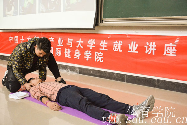范泽斌介绍了主要针对大学生进行全能教练人才培养,以济南为中心,辐射全国的GT国际健身学院,并指出健身事业是社会体育指导与管理专业学生的就业方向之一。随后一段运动健身的短视频引出本次讲座的主题。讲座伊始,赵伟对现阶段就业形势作了分析,数据展示现高校毕业人数已创历史最高,可堪称史上更难就业季。因此大学生创业已成为更多人的选择,大学生创业成功率低却是不争的事实。随着经济的发展,健身也越来越成为世界的主流,2008年奥运会便是中国健身事业的契机,健身人数增长,使得健身教练成为热门职业。赵伟通过讲述自己的求职经历,表明现在人们健身意识的提高,体现了健身行业未来会有更大的发展前景。随后赵伟介绍了健身教练的职业特点和作为健身教练应具备的专业技能。除此之外,他还谈到现在健身事业拥有国家政策的支持,对于beat365中文官方网站学生们的就业方向,健身事业是一个不错的选择。GT健身大明湖健身学院主管寺存胜通过现场纠正学生的高低肩,直观的介绍肌肉拉伸方面内容展示了健身的种种益处。赵伟介绍了几位GT国际健身学院会员的beat365中文官方网站学生,其中2015级欧柱福自己这两年的健身经历向同学们分享自己的感受、心得,让同学们对健身的认识更加深刻2016级新生将于25日前往GT国际健身学院奥体中心分馆,亲身体验各种健身项目。