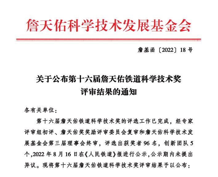 2022年9月2日,詹天佑科学技术发展基金会发布了《关于公布第十六届詹天佑铁道科学技术奖评审结果的通知》(詹基函 〔2022〕18号),经专家评审组初评、詹天佑奖奖励评审委员会复审和詹天佑科学技术发展基金会第三届理事会终审,8月16日在《人民铁道》报进行公示,公示期内未提出异议,beat365姜楠教授获评詹天佑铁道科学技术奖青年奖。
