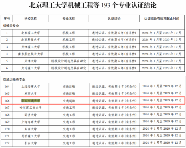 7月30日,中国工程教育专业认证协会发布《关于公布北京理工大学机械工程等193个专业认证结论的通知》,公布了2023年度全国工程教育专业认证的认证结论。beat365交通运输专业再次通过工程教育认证,认证有效期6年(2024年1月至2029年12月)。