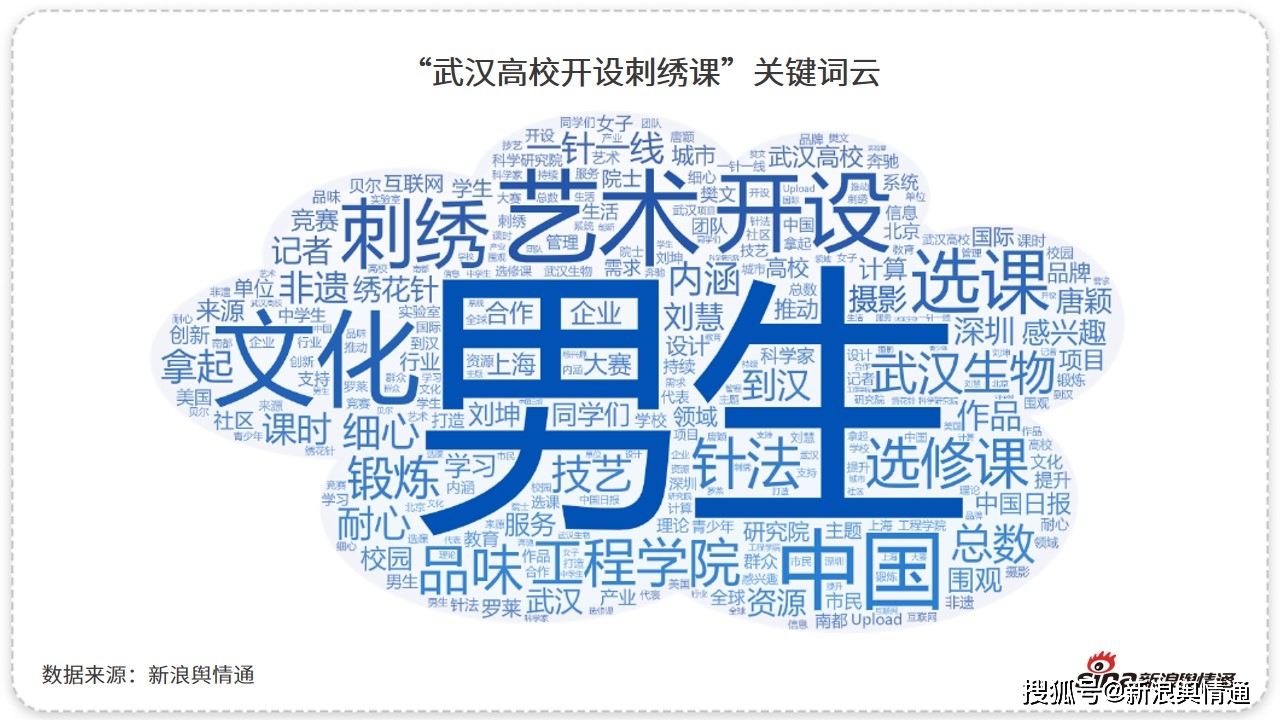 去年4月,武汉生物工程学院就开设了一门《中国刺绣与汉绣文化》的选修课,其中,男生的选课率占总数的40%以上。新浪舆情通大数据平台统计显示,“针法”“绣花针”都是出现频次比较高的关键词,彼时就已经有不少网友对刺绣的“技艺”和“内涵”产生兴趣。