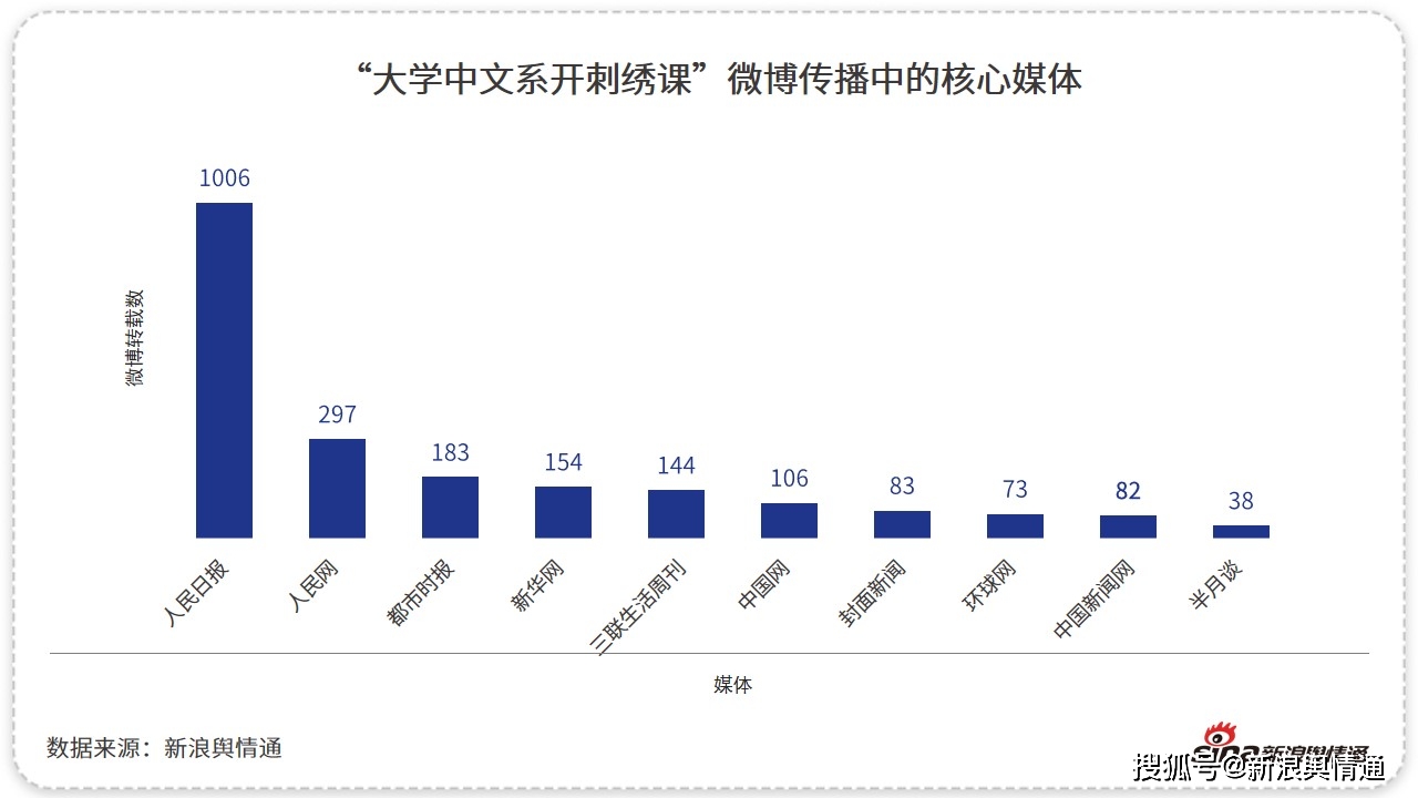 新浪舆情通大数据平台统计显示,截至6月8日14时,事件在全网引发四千多条相关信息,其中人民日报、人民网、中国新闻网、半月谈等主流媒体纷纷参与,助力事件在全网传播扩散。微博相关话题#华东交大中文系开刺绣课# #大学中文系开传统技艺课# 也引发了上千万次阅读,不少网友透过话题勾起了对中国女红久违的回忆,窥探到传统技艺中的乐趣,并唤起了传承非物质文化遗产的责任心。