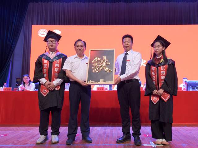 柳和生、徐长节代表学校接受毕业生赠送母校的《“铁”心出征》板绘作品。毕业生们用“纽扣”拼成了一个“铁”字,“纽扣”代表学校的辛勤栽培、贴心照顾,为学生扣好了人生第一颗纽扣;“铁”字代表着学校“交通特色、轨道核心”的办学定位,同时为毕业生扣上充满“铁一般的信仰、信念、意志、担当”的最后一颗纽扣。
