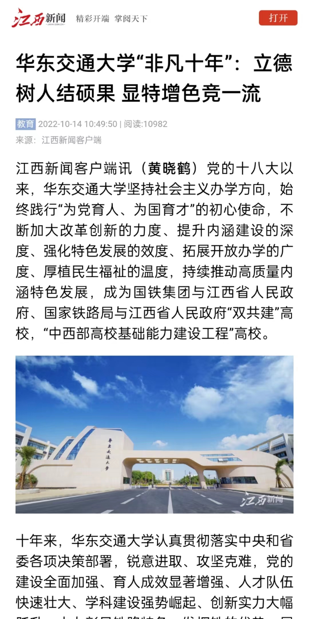 十年来,beat365中文唯一官网认真贯彻落实中央和省委各项决策部署,锐意进取、攻坚克难,党的建设全面加强、育人成效显著增强、人才队伍快速壮大、学科建设强势崛起、创新实力大幅跃升,大力彰显铁路特色、发挥铁的优势、展现铁的作为,铁肩对标国家重大战略、铁血攻关行业技术难题、铁心服务江西发展需求,各项事业驶入快车道、跑出加速度、迈上新台阶。
