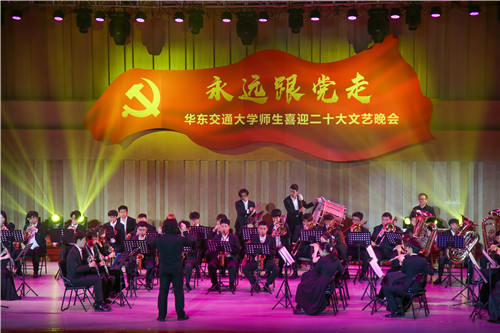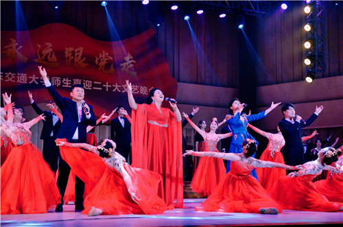 “华交出道在铁、出彩在铁、出路在铁、血脉中流淌着红色基因,精神上熔铸着‘铁’的特质”,《家国一体,命运与共》的宣讲将学校与国家紧紧联系在一起,展现了全校师生心系“国家事”、肩扛“国家责”、胸怀“两个大局”、牢记“国之大者”、立足“省之大业”、着眼“校之大计”,把满腔铁血熔铸于日常的坚守、镌刻在平凡的岗位、倾注进不懈地奋斗的坚定决心;“哪有什么岁月静好,不过是有人在替你负重前行”,原创舞蹈《我们这一代》通过片段式的表达,刻画了生活中平凡却伟大的人物——维护社会治安的警察、疫情中的逆行者医生、重庆山火中的凡人英雄消防员……当面临困难,他们总是不顾个人安危,为大家撑起一片天;情景表演《奉献》从细微处入手,体现小人物、大情感,小事件、大情怀的格局——一位女老师忍着病痛折磨坚守教学一线,尽心尽力为学生辅导,燃烧自己,照亮他人;二胡联奏《游击队之歌》 《骏马奔驰保边疆》、古筝重奏《我和我的祖国》、管乐重奏《钢铁洪流进行曲》曲调激昂、气势磅礴,回顾峥嵘岁月,从革命先烈精神中汲取奋进力量;“唱支山歌给党听,我把党来比母亲……”节目《党的光辉照我心》将场内气氛推向高潮,全场观众齐声合唱,把对党的祝福蕴含在深情的歌声中,全体师生对党的告白回荡在音乐厅,掌声和欢呼声经久不息。
