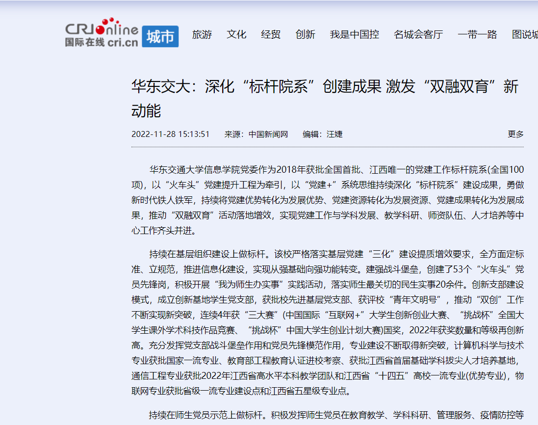 持续在基层组织建设上做标杆。该校严格落实基层党建“三化”建设提质增效要求,全方面定标准、立规范,推进信息化建设,实现从强基础向强功能转变。建强战斗堡垒,创建了53个“火车头”党员先锋岗,积极开展“我为师生办实事”实践活动,落实师生最关切的民生实事20余件。创新支部建设模式,成立创新基地学生党支部,获批校先进基层党支部、获评校“青年文明号”,推动“双创”工作不断实现新突破,连续4年获“三大赛”(中国国际“互联网+”大学生创新创业大赛、“挑战杯”全国大学生课外学术科技作品竞赛、“挑战杯”中国大学生创业计划大赛)国奖,2022年获奖数量和等级再创新高。充分发挥党支部战斗堡垒作用和党员先锋模范作用,专业建设不断取得新突破,计算机科学与技术专业获批国家一流专业、教育部工程教育认证进校考察、获批江西省首届基础学科拔尖人才培养基地,通信工程专业获批2022年江西省高水平本科教学团队和江西省“十四五”高校一流专业(优势专业),物联网专业获批省级一流专业建设点和江西省五星级专业点。