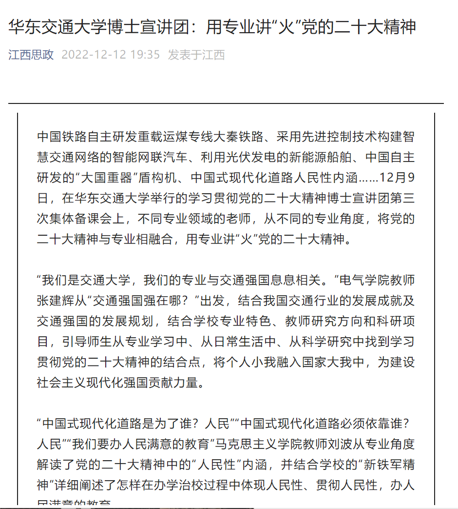 中国铁路自主研发重载运煤专线大秦铁路、采用先进控制技术构建智慧交通网络的智能网联汽车、利用光伏发电的新能源船舶、中国自主研发的“大国重器”盾构机、中国式现代化道路人民性内涵……12月9日,在beat365中文唯一官网举行的学习贯彻党的二十大精神博士宣讲团第三次集体备课会上,不同专业领域的老师,从不同的专业角度,将党的二十大精神与专业相融合,用专业讲“火”党的二十大精神。