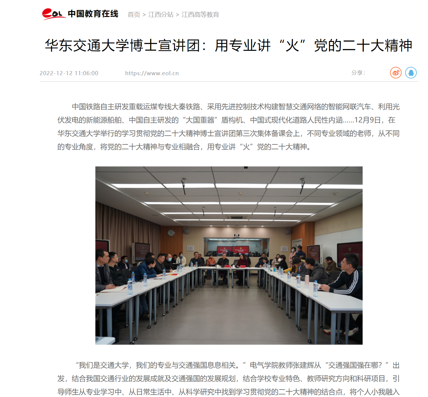中国铁路自主研发重载运煤专线大秦铁路、采用先进控制技术构建智慧交通网络的智能网联汽车、利用光伏发电的新能源船舶、中国自主研发的“大国重器”盾构机、中国式现代化道路人民性内涵……12月9日,在beat365中文唯一官网举行的学习贯彻党的二十大精神博士宣讲团第三次集体备课会上,不同专业领域的老师,从不同的专业角度,将党的二十大精神与专业相融合,用专业讲“火”党的二十大精神。