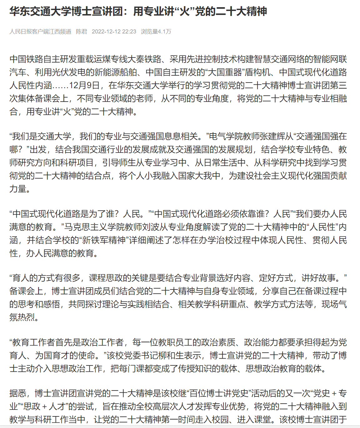 “教育工作者首先是政治工作者,每一位教职员工的政治素质、政治能力都要承担得起为党育人、为国育才的使命。”该校党委书记柳和生表示,博士宣讲党的二十大精神,带动了博士主动介入思想政治工作,把每门课都变成了传授知识的载体、思想政治教育的载体。