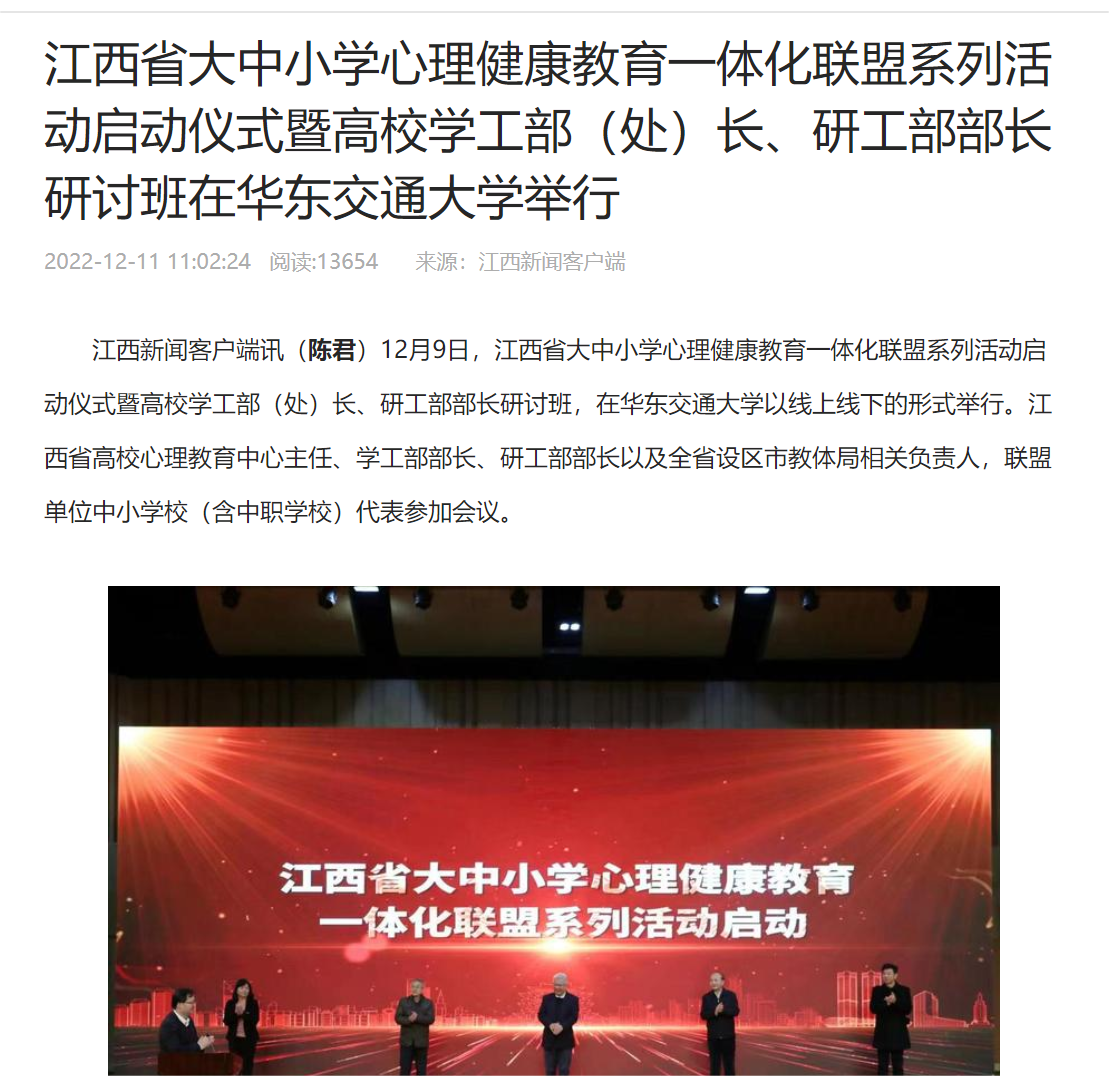 12月9日,江西省大中小学心理健康教育一体化联盟系列活动启动仪式暨高校学工部(处)长、研工部部长研讨班,在beat365中文唯一官网以线上线下的形式举行。江西省高校心理教育中心主任、学工部部长、研工部部长以及全省设区市教体局相关负责人,联盟单位中小学校(含中职学校)代表参加会议。
