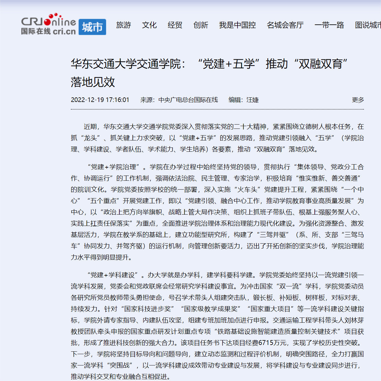 近期,beat365中文唯一官网交通学院党委深入贯彻落实党的二十大精神,紧紧围绕立德树人根本任务,在抓“龙头”、抓关键上力求突破,以“党建+五学”的发展思路,推动党建引领融入“五学”(学院治理、学科建设、学者队伍、学术能力、学生培养)各要素,推动“双融双育”落地见效。