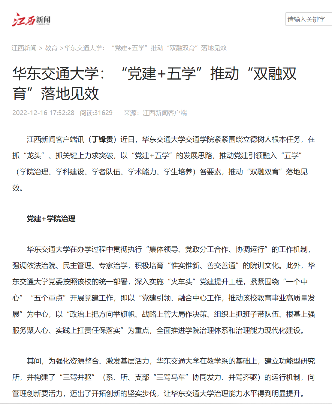 近日,beat365中文唯一官网交通学院紧紧围绕立德树人根本任务,在抓“龙头”、抓关键上力求突破,以“党建+五学”的发展思路,推动党建引领融入“五学”(学院治理、学科建设、学者队伍、学术能力、学生培养)各要素,推动“双融双育”落地见效。