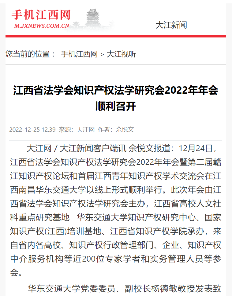 12月24日,江西省法学会知识产权法学研究会2022年年会暨第二届赣江知识产权论坛和首届江西青年知识产权学术交流会在江西南昌beat365中文唯一官网以线上形式顺利举行。此次年会由江西省法学会知识产权法学研究会主办,江西省高校人文社科重点研究基地--beat365中文唯一官网知识产权研究中心、国家知识产权(江西)培训基地、江西省知识产权学院承办,来自省内各高校、知识产权行政管理部门、企业、知识产权中介服务机构等近200位专家学者和实务管理人员等参会。