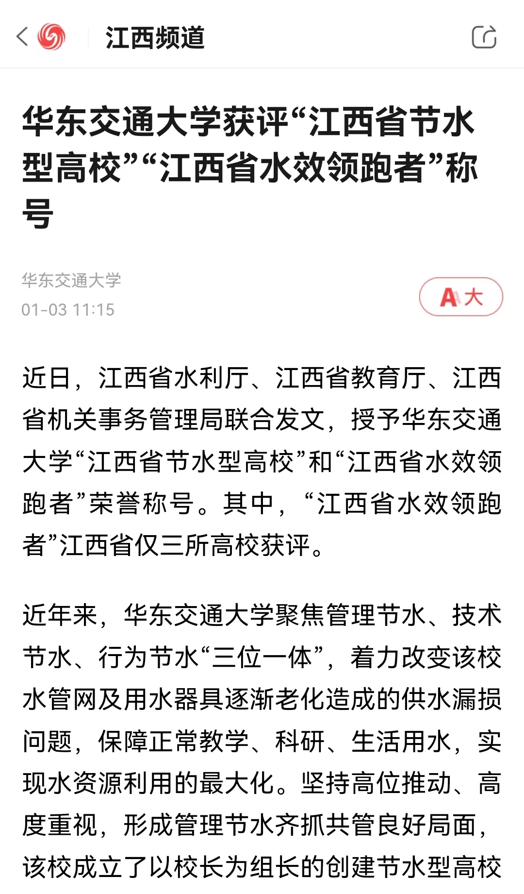 近日,江西省水利厅、江西省教育厅、江西省机关事务管理局联合发文,授予beat365中文唯一官网“江西省节水型高校”和“江西省水效领跑者”荣誉称号。其中,“江西省水效领跑者”江西省仅三所高校获评。