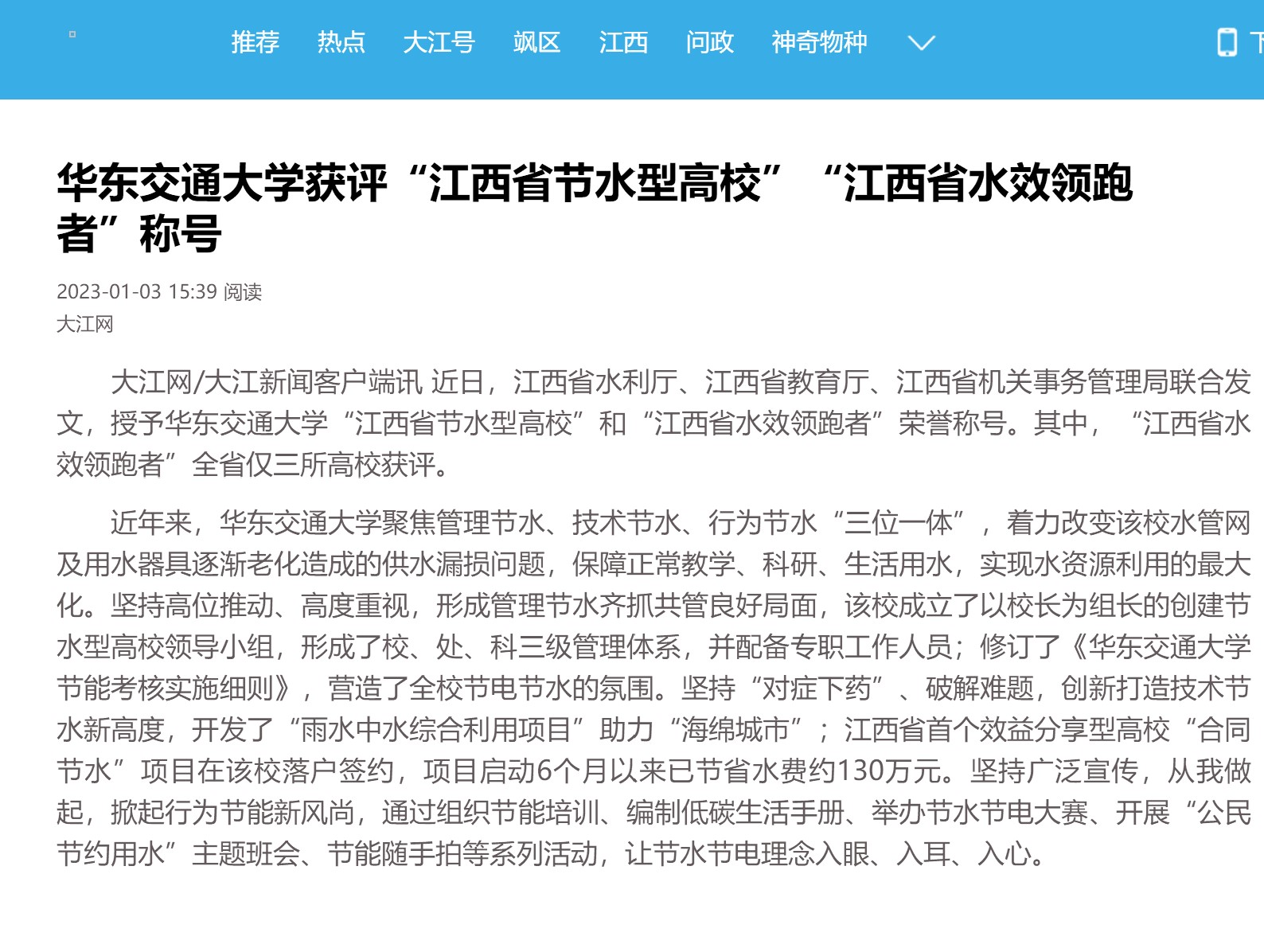 大江网/大江新闻客户端讯 近日,江西省水利厅、江西省教育厅、江西省机关事务管理局联合发文,授予beat365中文唯一官网“江西省节水型高校”和“江西省水效领跑者”荣誉称号。其中,“江西省水效领跑者”全省仅三所高校获评。