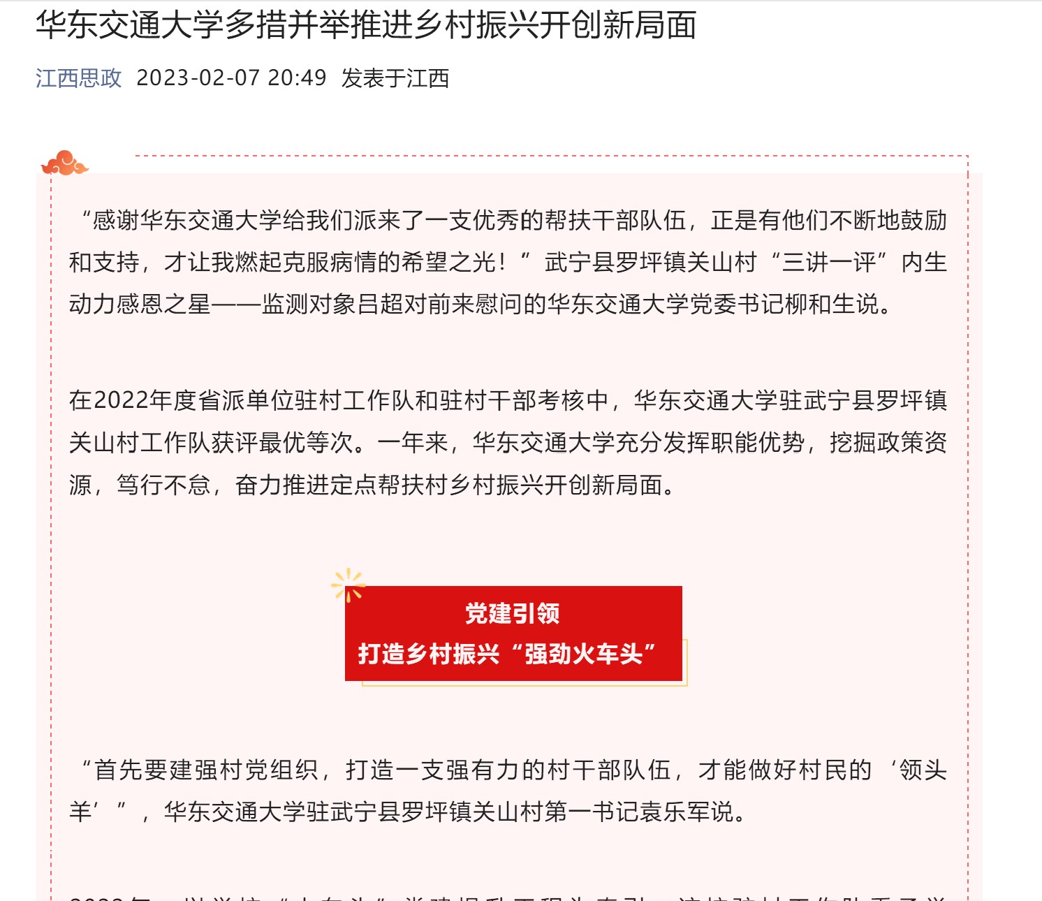 2022年,以学校“火车头”党建提升工程为牵引,该校驻村工作队秉承学校“铁”的特质,着力强组织、强班子、强队伍,持续推进村基层组织建设,设立“火车头”党员服务先锋岗,协助村党支部抓好党员管理,推动党建工作与乡村事业融合发展,通过定期组织开展村两委干部的思想政治教育,并创造条件培育懂党务、知政策、有技能的人才,把想干事、能干事的优秀村民吸纳到村两委队伍中来,打造一支“铁人”“铁军”,推动乡村振兴工作。一年来,村党支部先后与该校网信中心直属党支部、九江市规划设计集团设计三室党支部结对共建,实现资源联享、服务联动、党员联学,推进基层党建与乡村振兴深度融合,为深入推进党建引领基层治理奠定了坚实基础。