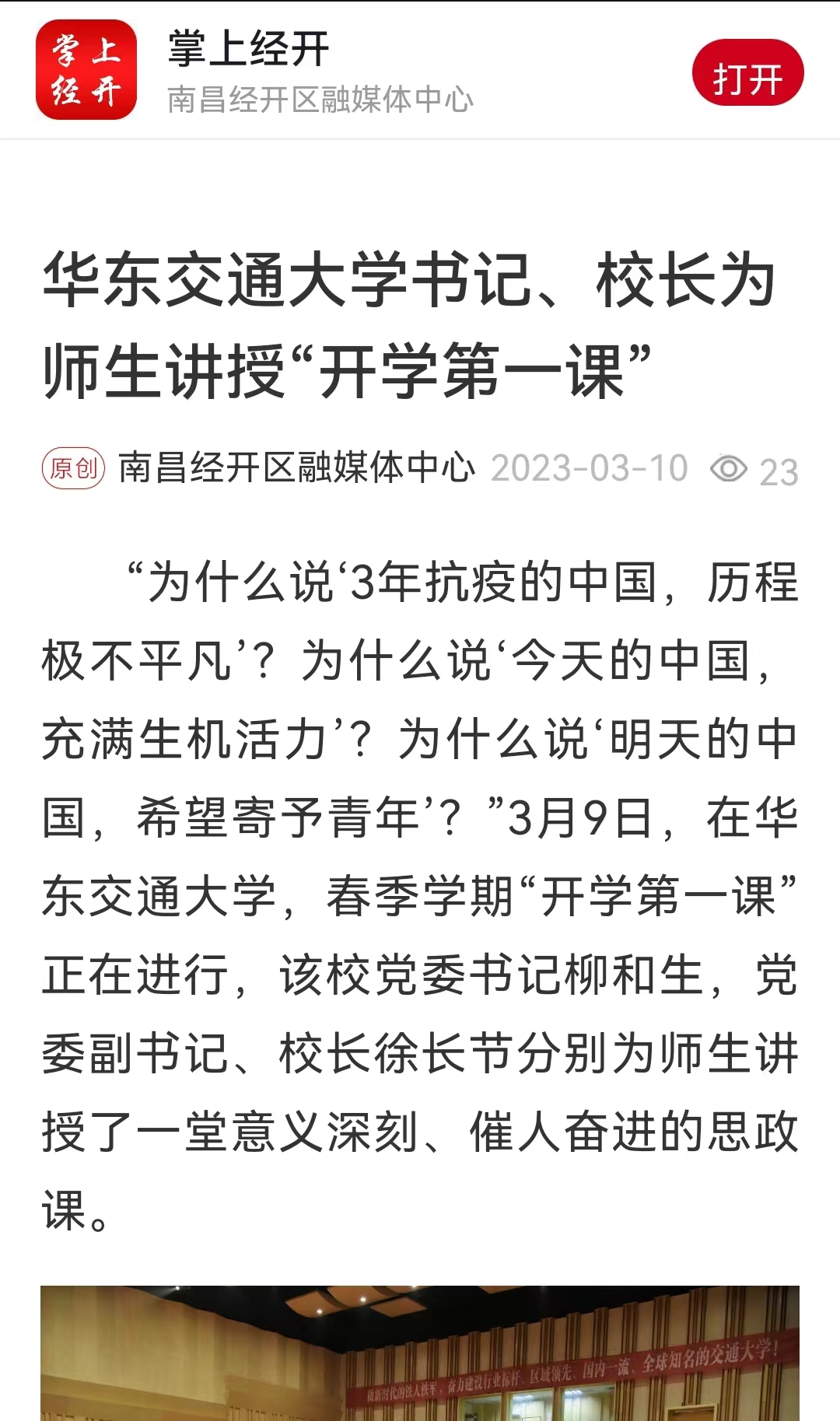 “为什么说‘3年抗疫的中国,历程极不平凡’?为什么说‘今天的中国,充满生机活力’?为什么说‘明天的中国,希望寄予青年’?”3月9日,在beat365中文唯一官网,春季学期“开学第一课”正在进行,该校党委书记柳和生,党委副书记、校长徐长节分别为师生讲授了一堂意义深刻、催人奋进的思政课。