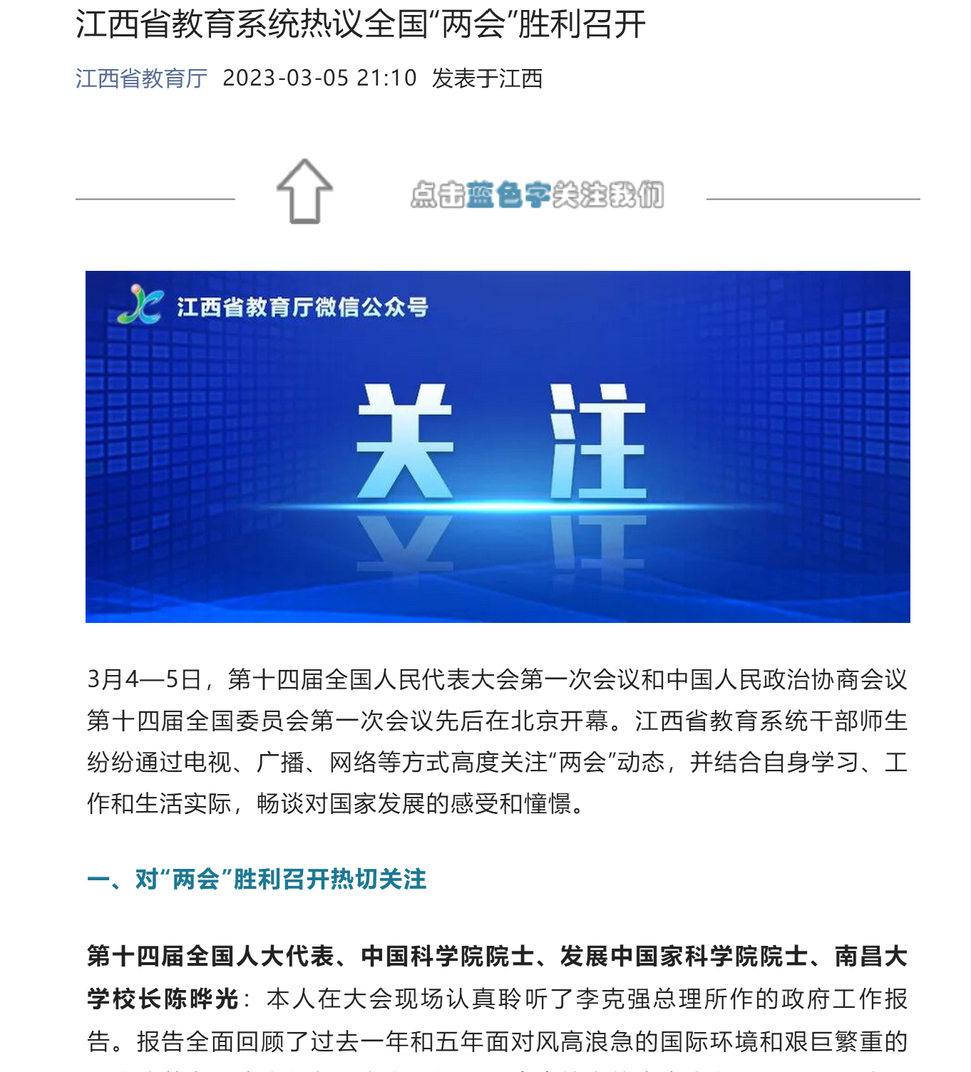 第十四届全国人大代表、中国科学院院士、发展中国家科学院院士、南昌大学校长陈晔光:本人在大会现场认真聆听了李克强总理所作的政府工作报告。报告全面回顾了过去一年和五年面对风高浪急的国际环境和艰巨繁重的国内改革发展稳定任务,在以习近平同志为核心的党中央坚强领导下,我国经济社会发展取得来之极为不易的新成就;明确了2023年和下一阶段目标任务和发展方向,鼓舞人心、催人奋进。南昌大学作为江西省唯一的国家“双一流”计划世界一流学科建设高校、教育部与江西省部省合建高校和江西省高水平大学整体建设高校,我们将以习近平新时代中国特色社会主义思想为指引,深入贯彻党的二十大精神,牢记习近平总书记视察江西和南昌大学的嘱托,发挥好高校科技第一生产力、人才第一资源和创新第一动力结合点的作用,坚定不移贯彻落实科教兴国战略、人才强国战略和创新驱动发展战略,坚持科学的教育理念,落实立德树人的根本任务,推进人才培养与社会需求紧密结合,全面提高人才培养质量;坚持走创新发展之路,围绕国家和江西重大战略需求,加强学术导向,完善学术评价标准,推进科技创新和人才队伍建设,提升基础研究水平和原始创新能力,以深化产教融合助推高质量发展,为全面建设社会主义现代化国家和江西作出应有贡献。