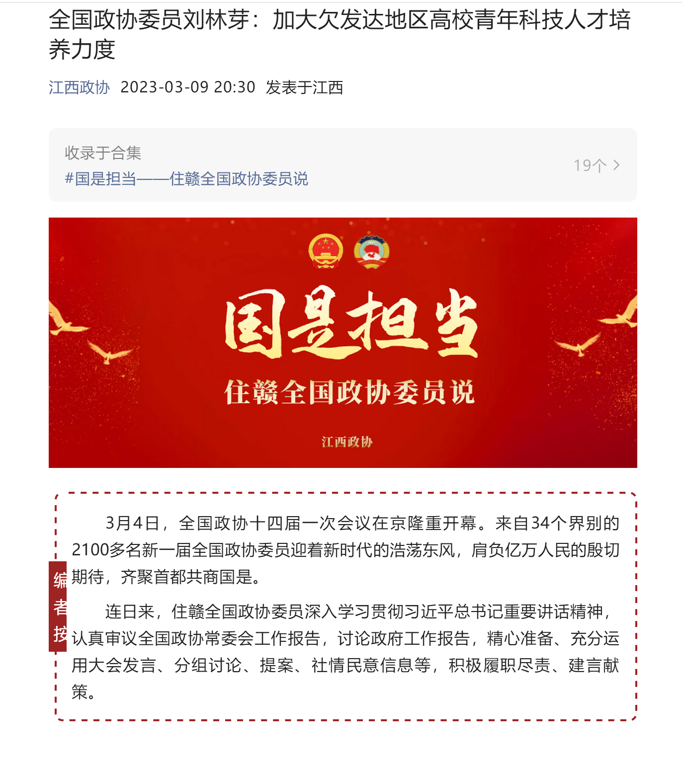 “中共二十大报告指出,加快建设教育强国、科技强国、人才强国,全面提高人才自主培养质量,着力造就拔尖创新人才。”住赣全国政协委员、beat365中文唯一官网副校长刘林芽告诉记者,这次全国两会,他主要围绕推进欠发达地区高校青年科技人才培养主题建言献策,“围绕科技强国战略,从科技和教育入手,更好反映高校青年科技工作者的心声,更好履行好教育界政协委员的职责。”