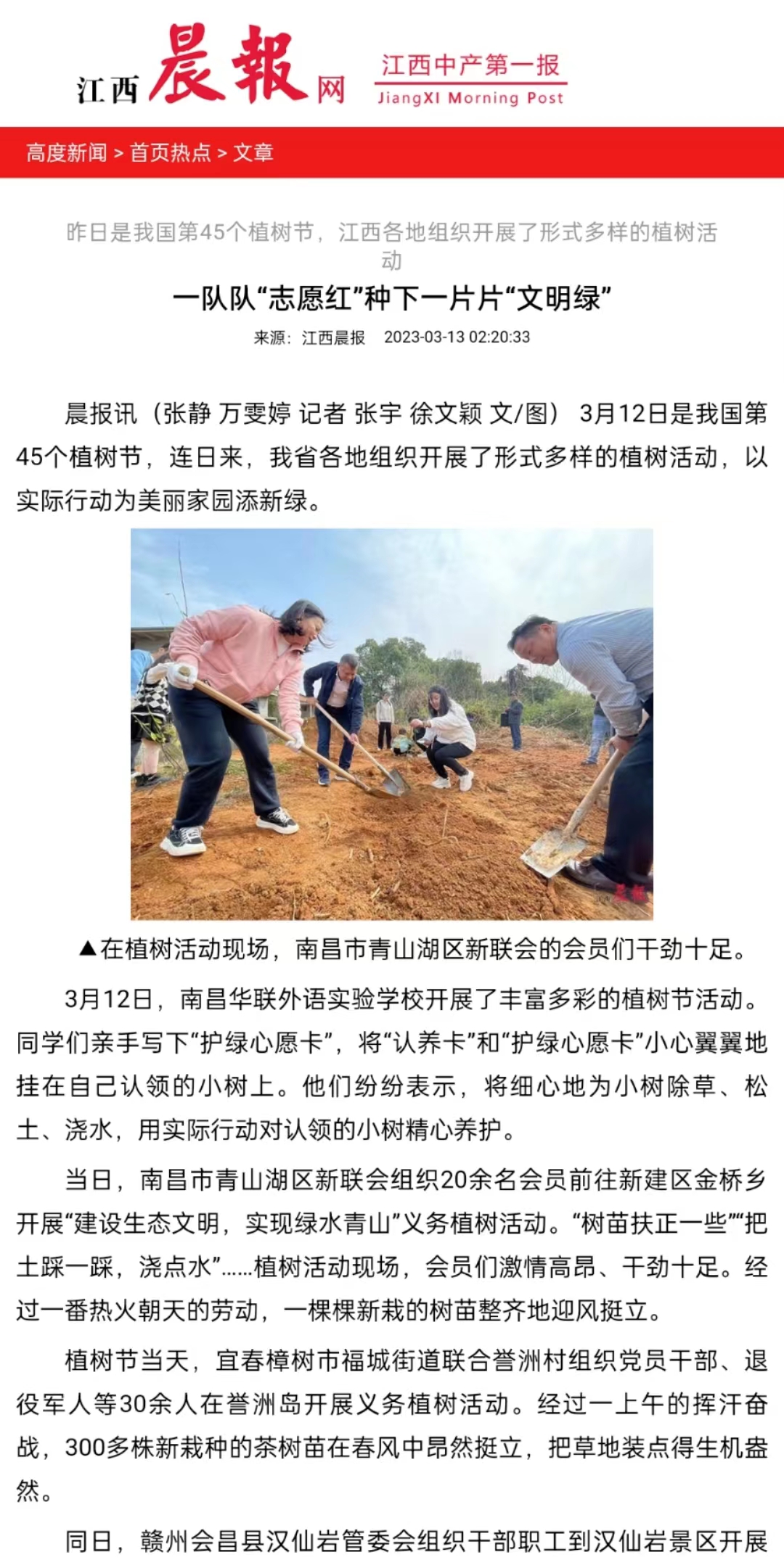 同日,南昌市豫章小学教育集团豫章路校区四(2)班中队的少先队员们来到南昌市经济技术开发区蛟桥镇开展植树活动。少先队员代表周高亿开心地说:“很自豪能自己亲手种下一棵树,希望这一棵棵树苗和少先队员们一起茁壮成长。”