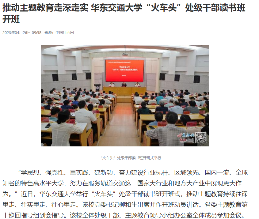 柳和生指出,举办“火车头”处级干部读书班,是学校开展学习贯彻主题教育的重要抓手。要全面学习领会其科学体系、精髓要义、实践要求,坚持原原本本学、全面系统学,灵活方式学、反复深入学,更加自觉深刻领悟“两个确立”的决定性意义,增强“四个意识”、坚定“四个自信”、做到“两个维护”。要在学习中进一步明确“为了谁、依靠谁”,多思考师生的关切和需要,以师生满意与否作为检验工作成效的根本标准,把理想信念内化成为师生办实事的源动力,不断增强师生的获得感、幸福感、安全感。要紧紧围绕新时代新征程党的中心任务,对标国家重大战略、江西发展需求,瞄准学校目标任务,紧密结合自身岗位,运用党的创新理论指导基层实践、推动具体工作,把理论学习与调查研究、推动发展、检视整改有机结合,认真查摆认知上的偏差和行动上的不足,铆足干劲为推动高质量发展、服务师生、防范化解风险等履好职、尽好责。