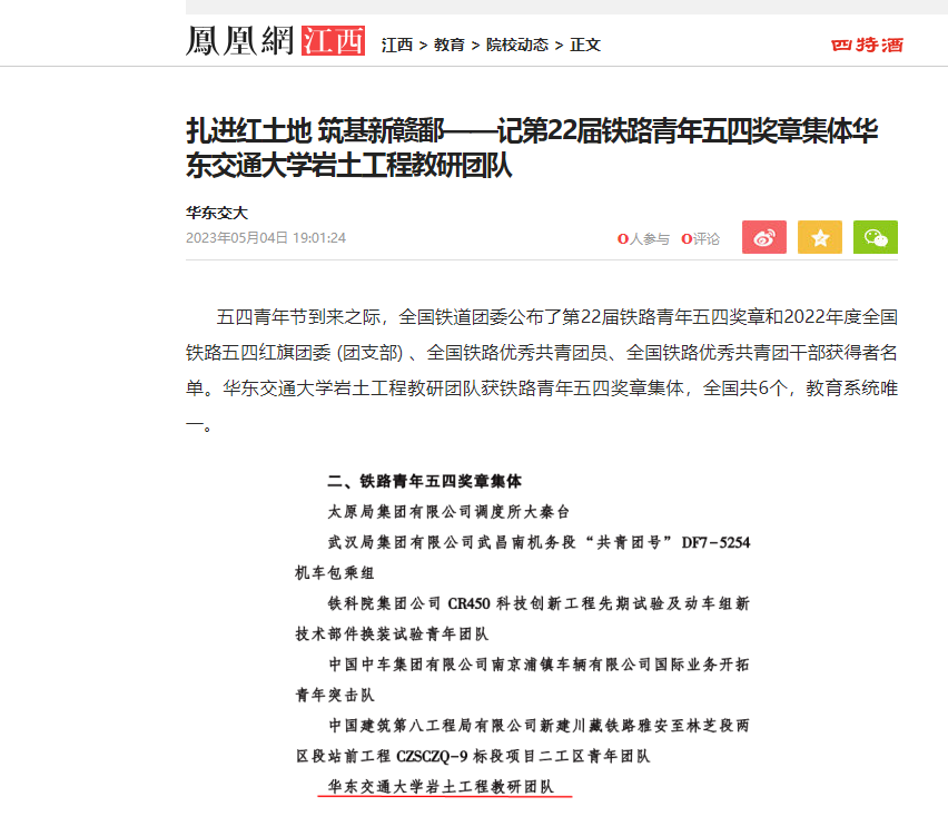 五四青年节到来之际,全国铁道团委公布了第22届铁路青年五四奖章和2022年度全国铁路五四红旗团委 (团支部) 、全国铁路优秀共青团员、全国铁路优秀共青团干部获得者名单。beat365中文唯一官网岩土工程教研团队获铁路青年五四奖章集体,全国共6个,教育系统唯一。
