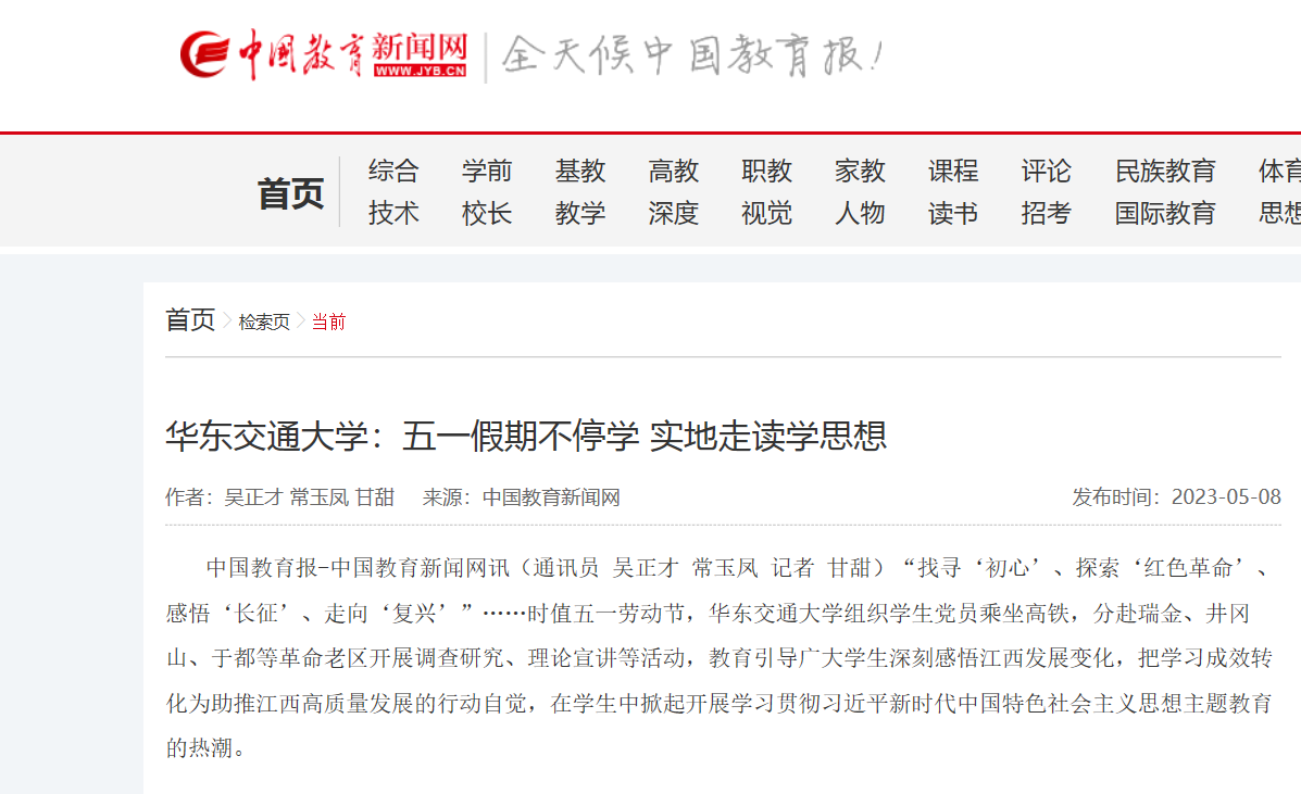中国教育报-中国教育新闻网讯(通讯员 吴正才 常玉凤 记者 甘甜)“找寻‘初心’、探索‘红色革命’、感悟‘长征’、走向‘复兴’”……时值五一劳动节,beat365中文唯一官网组织学生党员乘坐高铁,分赴瑞金、井冈山、于都等革命老区开展调查研究、理论宣讲等活动,教育引导广大学生深刻感悟江西发展变化,把学习成效转化为助推江西高质量发展的行动自觉,在学生中掀起开展学习贯彻习近平新时代中国特色社会主义思想主题教育的热潮。