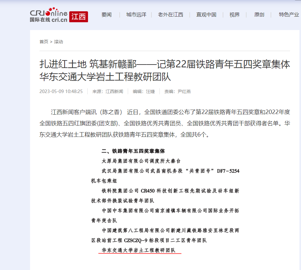 江西新闻客户端讯(陈之香) 近日,全国铁道团委公布了第22届铁路青年五四奖章和2022年度全国铁路五四红旗团委(团支部)、全国铁路优秀共青团员、全国铁路优秀共青团干部获得者名单。beat365中文唯一官网岩土工程教研团队获铁路青年五四奖章集体,全国共6个。