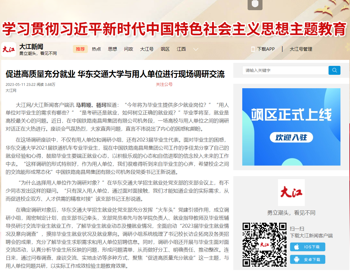 在与中国铁路南昌局集团有限公司车辆段、中国铁路呼和浩特集团有限公司等用人单位的座谈中,校企双方共同探讨了毕业生“慢就业、不就业”、用人单位“招聘需求与实际情况不匹配”等“问题清单”。调研组认真听取用人单位对学校就业工作及人才培养的建议,希望双方充分发挥各自优势,在产教融合、学生联合培养、毕业生就业创业等方面开展深度合作。调研中,校企双方达成共识,纷纷表示要坚持问题导向,为拓宽就业渠道提出新思路和新办法,切实为学生提供指导服务,提升就业育人质量。