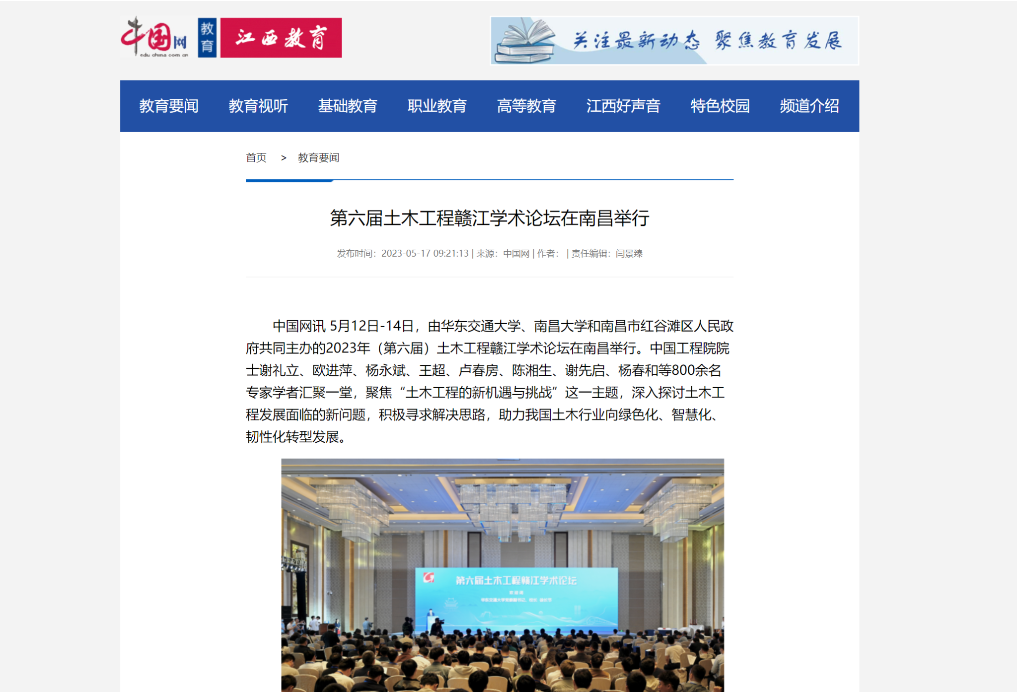 中国网讯 5月12日-14日,由beat365中文唯一官网、南昌大学和南昌市红谷滩区人民政府共同主办的2023年(第六届)土木工程赣江学术论坛在南昌举行。中国工程院院士谢礼立、欧进萍、杨永斌、王超、卢春房、陈湘生、谢先启、杨春和等800余名专家学者汇聚一堂,聚焦“土木工程的新机遇与挑战”这一主题,深入探讨土木工程发展面临的新问题,积极寻求解决思路,助力我国土木行业向绿色化、智慧化、韧性化转型发展。