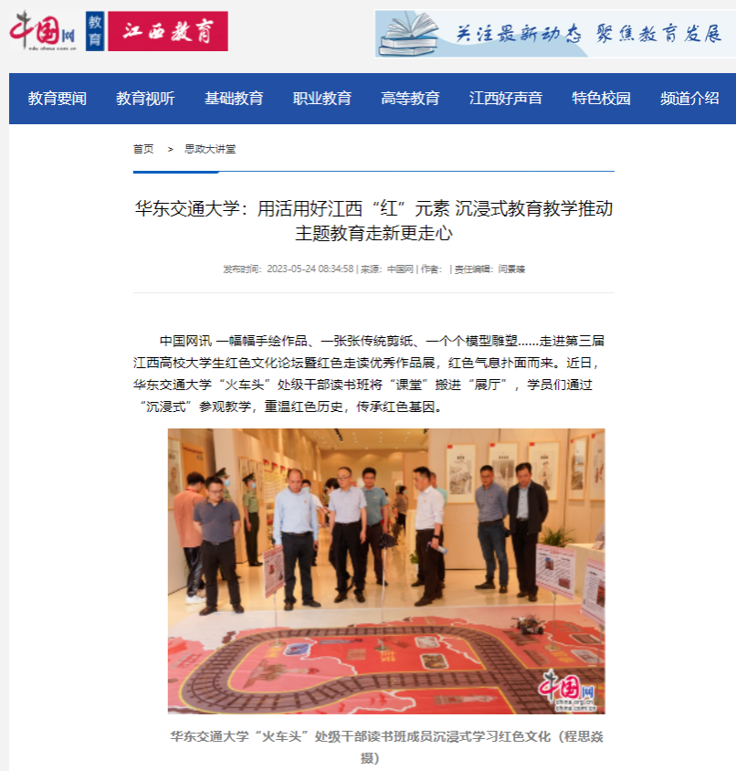 华东交大将主题参观江西省红色文化论坛暨红色走读优秀作品展纳入“火车头”处级干部读书班理论学习内容,是提升理论学习质效的一次生动实践,进一步深化了党员干部对中国共产党人精神谱系的认知感悟。“江西拥有丰富的红色资源,通过创新形式、丰富载体,深入挖掘红色文化丰富内涵,生动鲜活讲好红色故事,教育引导广大党员干部深刻感悟初心使命和信仰的力量,扎实推动主题教育理论学习走深走实、落地落细。”该校宣传部负责人说。