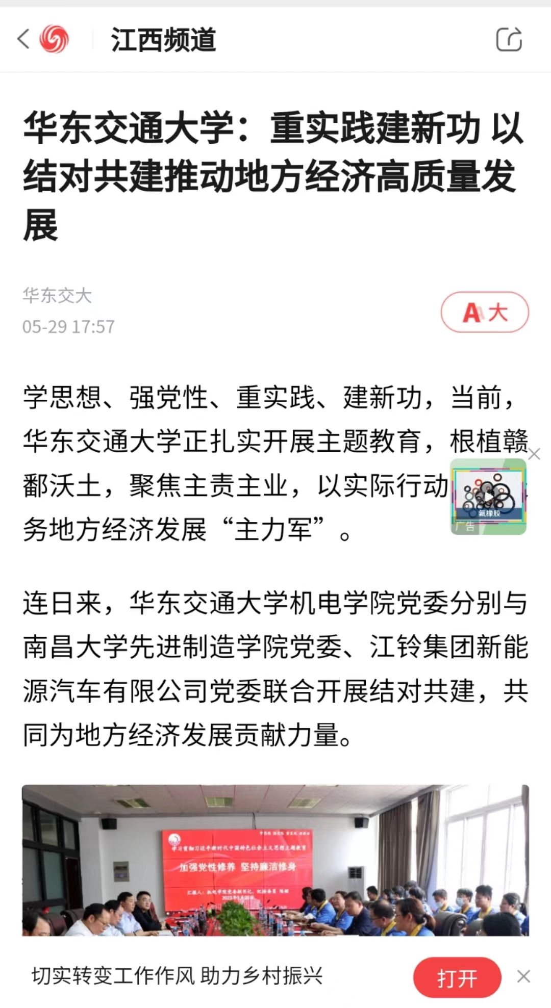 连日来,beat365中文唯一官网机电学院党委分别与南昌大学先进制造学院党委、江铃集团新能源汽车有限公司党委联合开展结对共建,共同为地方经济发展贡献力量。