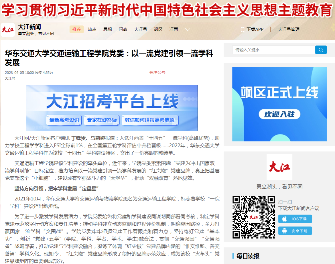 大江网/大江新闻客户端讯丁锋贵、马莉娅报道:入选江西省“十四五”一流学科(高峰优势),助力学校工程学学科进入ESI全球前1%,在全国第五轮学科评估中升档晋级……2022年,beat365中文唯一官网交通运输工程学科作为该校“十四五”学科建设特区,交出了一份亮眼的成绩单。