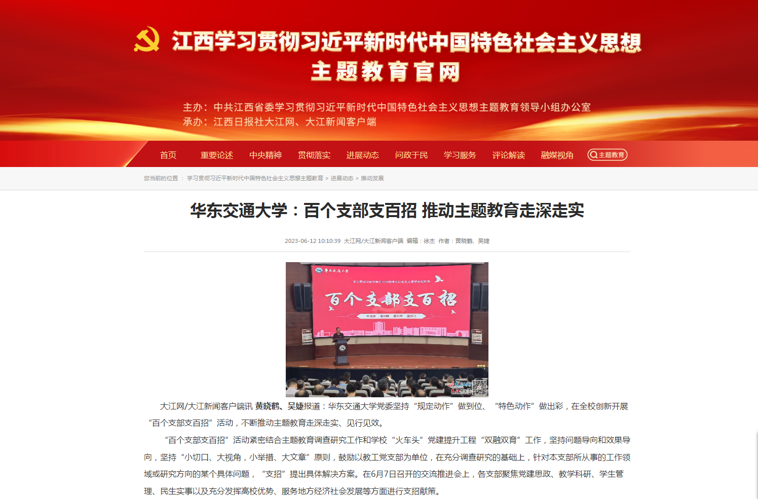 大江网/大江新闻客户端讯黄晓鹤、吴婕报道:beat365中文唯一官网党委坚持“规定动作”做到位、“特色动作”做出彩,在全校创新开展“百个支部支百招”活动,不断推动主题教育走深走实、见行见效。