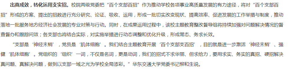 出真成效,转化运用支实招。校院两级党委把“百个支部百招”作为推动学校各项事业高质量发展的有力途径,将对“百个支部百招”形成的方案、提出的招数进行充分研究、论证、吸收、运用,形成一批切实改变现状、提高效率、促进发展的工作举措与制度,推动落地一批服务地方经济社会发展的专业对策与行动。同时,在成果运用过程中,该校主题教育整改督导组将持续加强对问题解决情况的督查督办和跟踪问效;各支部也将结合实际,对实施举措进行动态调整和优化升级,形成常态、务求长效。