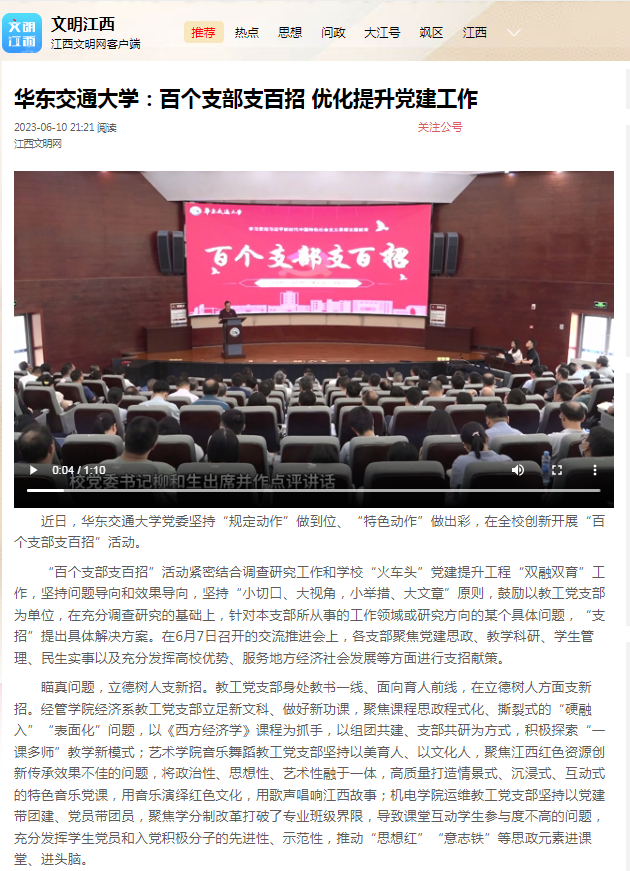 瞄真问题,立德树人支新招。教工党支部身处教书一线、面向育人前线,在立德树人方面支新招。经管学院经济系教工党支部立足新文科、做好新功课,聚焦课程思政程式化、撕裂式的“硬融入”“表面化”问题,以《西方经济学》课程为抓手,以组团共建、支部共研为方式,积极探索“一课多师”教学新模式;艺术学院音乐舞蹈教工党支部坚持以美育人、以文化人,聚焦江西红色资源创新传承效果不佳的问题,将政治性、思想性、艺术性融于一体,高质量打造情景式、沉浸式、互动式的特色音乐党课,用音乐演绎红色文化,用歌声唱响江西故事;机电学院运维教工党支部坚持以党建带团建、党员带团员,聚焦学分制改革打破了专业班级界限,导致课堂互动学生参与度不高的问题,充分发挥学生党员和入党积极分子的先进性、示范性,推动“思想红”“意志铁”等思政元素进课堂、进头脑。