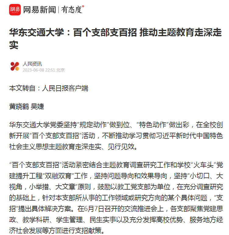 下真功夫,推动发展支硬招。“双百”“支招”,贵在实招管用、落地见效。首批40个教工党支部强化问题导向、坚持守正创新,形成问题清单40个,提出支招举措116条,推动落实举措42条,不断将调研成果转化为破解难题的新招妙招、改进工作的实招硬招。聚焦江西所需,土建学院岩土道路工程教工党支部充分发挥人才智力优势,与萍乡绕城高速公路项目党支部共建博士团创新工作室,共同打造人才培养、科技攻关、科普教育、教学示范基地,服务交通强省建设;聚焦学校所急,国际学院教工党支部精准对标综合考核的短板弱项,制定“七个一”任务清单,逐项攻坚突破,切实提高国际交流合作水平;聚焦师生所盼,华交产业集团直属党支部创新推出“智慧华交小铁”综合服务平台,全力打造校园智慧生活圈,让师生享受更加精细、多元、智能的提品增质服务。