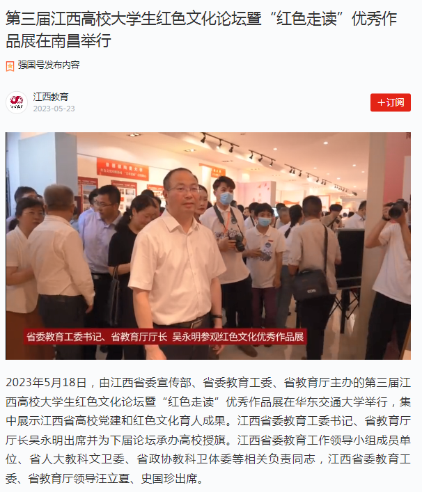 2023年5月18日,由江西省委宣传部、省委教育工委、省教育厅主办的第三届江西高校大学生红色文化论坛暨“红色走读”优秀作品展在beat365中文唯一官网举行,集中展示江西省高校党建和红色文化育人成果。江西省委教育工委书记、省教育厅厅长吴永明出席并为下届论坛承办高校授旗。江西省委教育工作领导小组成员单位、省人大教科文卫委、省政协教科卫体委等相关负责同志,江西省委教育工委、省教育厅领导汪立夏、史国珍出席。