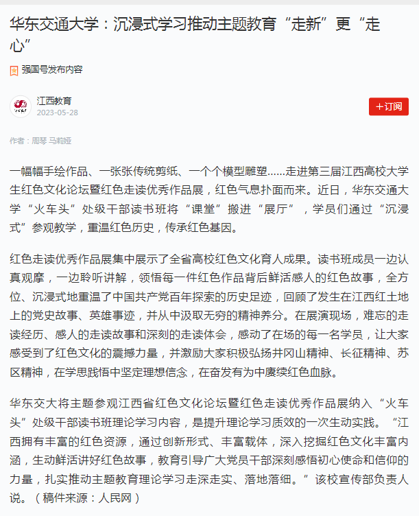 华东交大将主题参观江西省红色文化论坛暨红色走读优秀作品展纳入“火车头”处级干部读书班理论学习内容,是提升理论学习质效的一次生动实践。“江西拥有丰富的红色资源,通过创新形式、丰富载体,深入挖掘红色文化丰富内涵,生动鲜活讲好红色故事,教育引导广大党员干部深刻感悟初心使命和信仰的力量,扎实推动主题教育理论学习走深走实、落地落细。”该校宣传部负责人说。