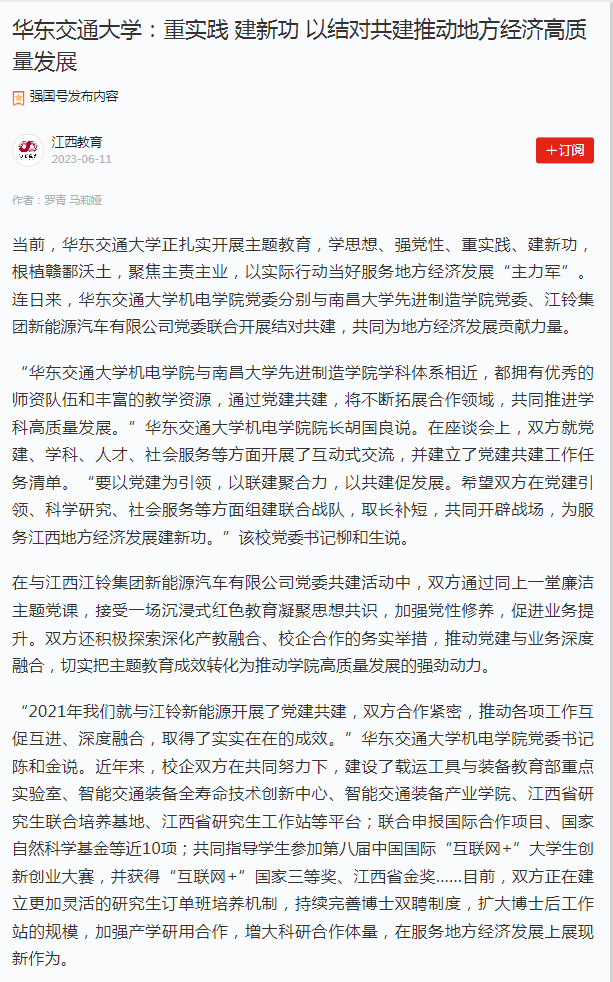 “2021年我们就与江铃新能源开展了党建共建,双方合作紧密,推动各项工作互促互进、深度融合,取得了实实在在的成效。”beat365中文唯一官网机电学院党委书记陈和金说。近年来,校企双方在共同努力下,建设了载运工具与装备教育部重点实验室、智能交通装备全寿命技术创新中心、智能交通装备产业学院、江西省研究生联合培养基地、江西省研究生工作站等平台;联合申报国际合作项目、国家自然科学基金等近10项;共同指导学生参加第八届中国国际“互联网+”大学生创新创业大赛,并获得“互联网+”国家三等奖、江西省金奖……目前,双方正在建立更加灵活的研究生订单班培养机制,持续完善博士双聘制度,扩大博士后工作站的规模,加强产学研用合作,增大科研合作体量,在服务地方经济发展上展现新作为。