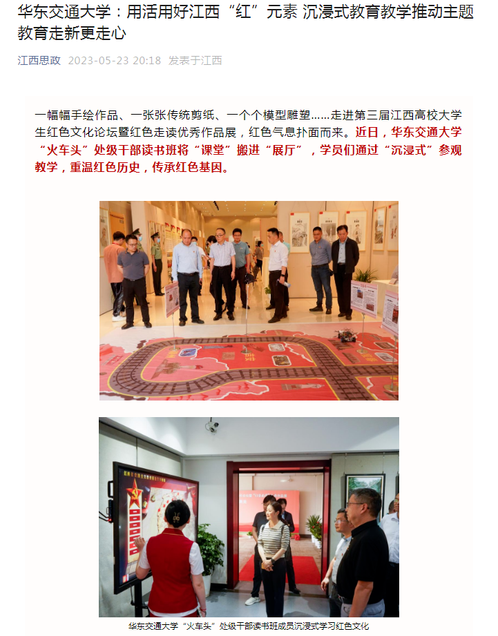 一幅幅手绘作品、一张张传统剪纸、一个个模型雕塑……走进第三届江西高校大学生红色文化论坛暨红色走读优秀作品展,红色气息扑面而来。近日,beat365中文唯一官网“火车头”处级干部读书班将“课堂”搬进“展厅”,学员们通过“沉浸式”参观教学,重温红色历史,传承红色基因。