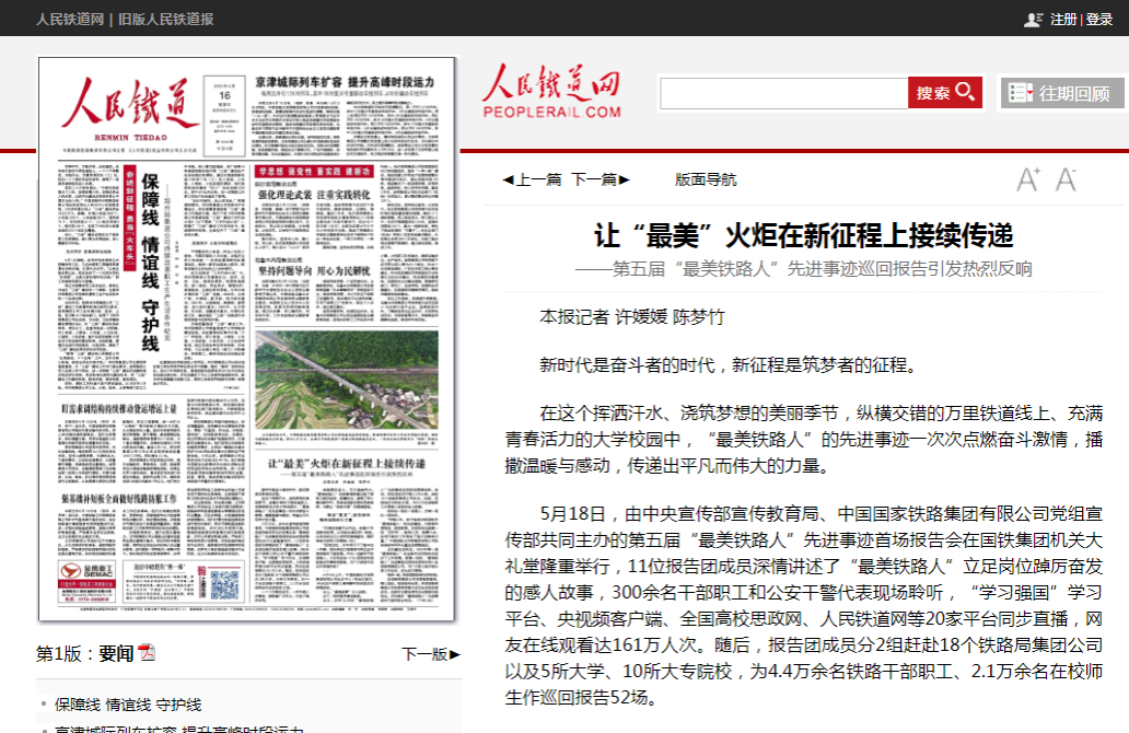 5月18日,由中央宣传部宣传教育局、中国国家铁路集团有限公司党组宣传部共同主办的第五届“最美铁路人”先进事迹首场报告会在国铁集团机关大礼堂隆重举行,11位报告团成员深情讲述了“最美铁路人”立足岗位踔厉奋发的感人故事,300余名干部职工和公安干警代表现场聆听,“学习强国”学习平台、央视频客户端、全国高校思政网、人民铁道网等20家平台同步直播,网友在线观看达161万人次。随后,报告团成员分2组赶赴18个铁路局集团公司以及5所大学、10所大专院校,为4.4万余名铁路干部职工、2.1万余名在校师生作巡回报告52场。