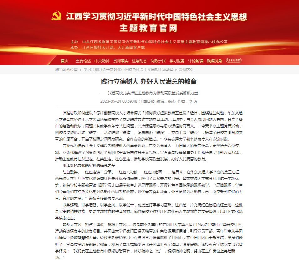 以学铸魂、以学增智、以学正风、以学促干,前提是打牢学习基础。江西是一片充满红色记忆的红土地,这既是宝贵的精神财富,更是主题教育的鲜活教材。我省高校坚持把红色文化融入主题教育并贯穿始终,以红色文化筑牢信念之基。
