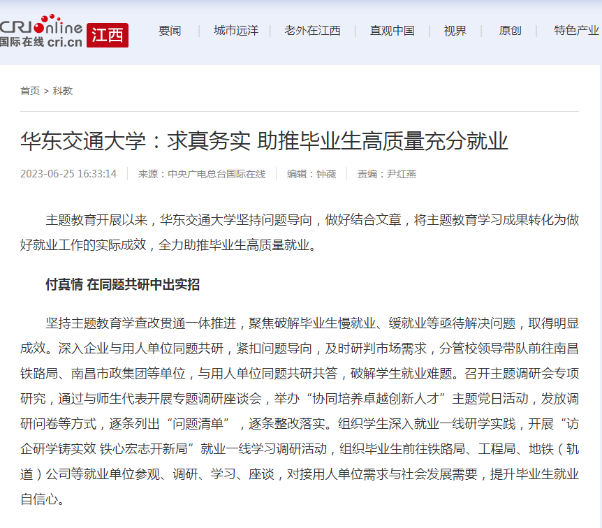 坚持主题教育学查改贯通一体推进,聚焦破解毕业生慢就业、缓就业等亟待解决问题,取得明显成效。深入企业与用人单位同题共研,紧扣问题导向,及时研判市场需求,分管校领导带队前往南昌铁路局、南昌市政集团等单位,与用人单位同题共研共答,破解学生就业难题。召开主题调研会专项研究,通过与师生代表开展专题调研座谈会,举办“协同培养卓越创新人才”主题党日活动,发放调研问卷等方式,逐条列出“问题清单”,逐条整改落实。组织学生深入就业一线研学实践,开展“访企研学铸实效 铁心宏志开新局”就业一线学习调研活动,组织毕业生前往铁路局、工程局、地铁(轨道)公司等就业单位参观、调研、学习、座谈,对接用人单位需求与社会发展需要,提升毕业生就业自信心。
