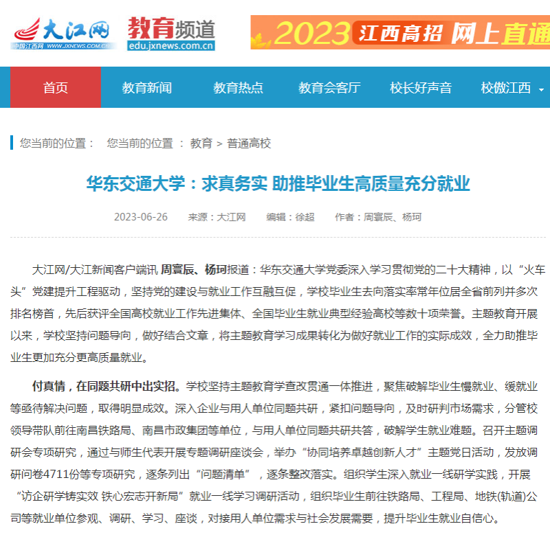 就业是最大的民生。主题教育开展以来,学校进一步完善了提高效率、促进发展的就业工作举措,推动了一批服务学生就业能力提升的对策与行动。下一步,华东交大将继续推进主题教育与就业工作同频共振、一体推进,全力推动毕业生高质量充分就业。