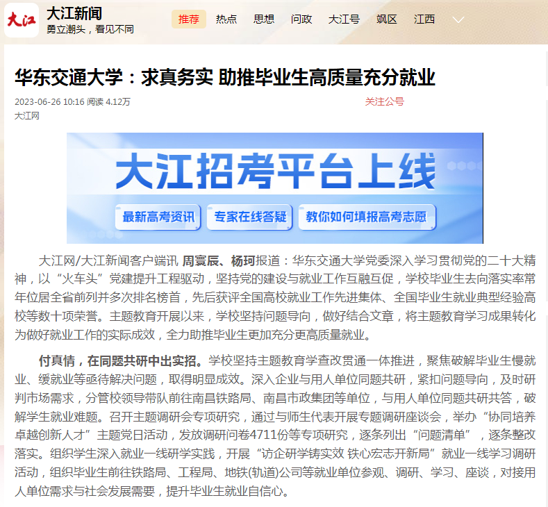 就业是最大的民生。主题教育开展以来,学校进一步完善了提高效率、促进发展的就业工作举措,推动了一批服务学生就业能力提升的对策与行动。下一步,华东交大将继续推进主题教育与就业工作同频共振、一体推进,全力推动毕业生高质量充分就业。